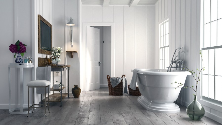 Try different shapes of tiles on the floor and in the shower, with crisp paint on the walls and all white accents.